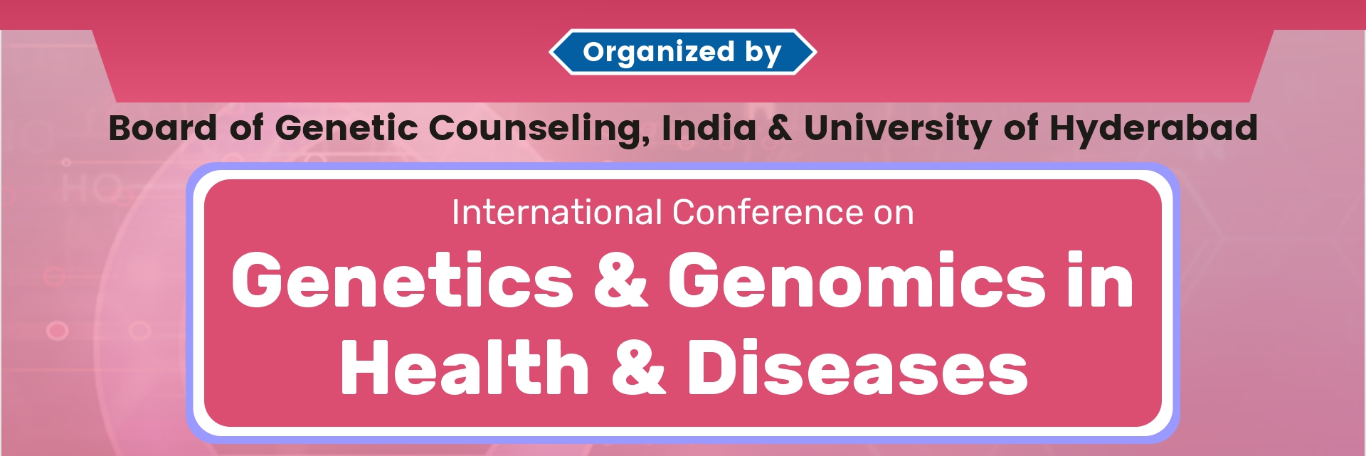 The Board of Genetic Counseling India cordially invites you to participate in the 8th Annual International Conference to be held at School of Life Sciences, South Campus Hyderabad in a Hybrid Mode from 7th - 9th July 2023. The theme of this conference is "Genetics & Genomics in Health and Disease".